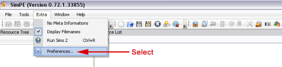 1. In the SimPE menu bar, choose Extra -> Preferences…