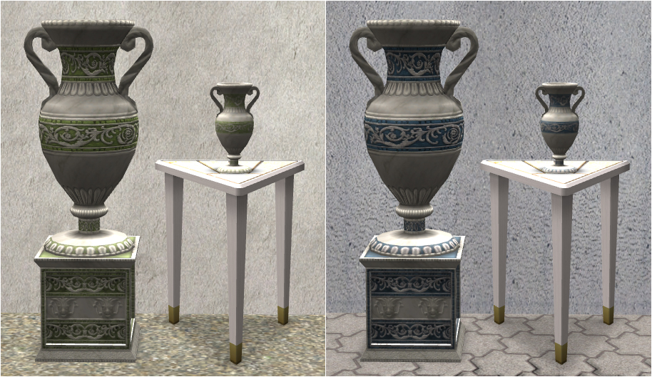 If you think this looks a lot like the Ancient Transport Urn from the base game, then you… are absolutely correct. 😉 This is the Ancient Transport Urn, only without the column and reduced in size so you can put it on a table or a shelf. It’s base-game compatible, but it can be placed on all surfaces – including, but not limited to, OFB shelves and deco slots like on dressers and mantles.