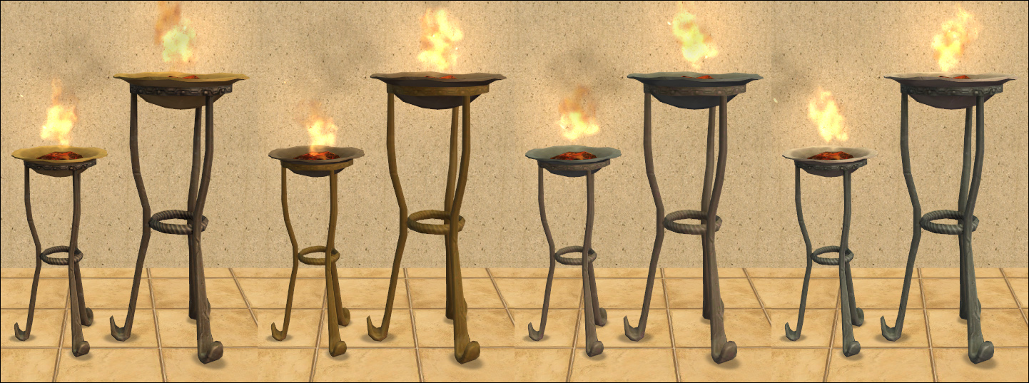 poly. Again, the TSM original is quite large – you could fry a Sim in it and still have room to spare – so you get a scaled down version of this one as well. Also, the large brazier is a little larger than one tile, so if you place it right next to a wall, there will be clipping. (Yes, it probably would have been happier on four tiles, but multi-tile floor lamps… yeah, that won’t be happening.) You can move it with the M&G quartertile cheat, though.