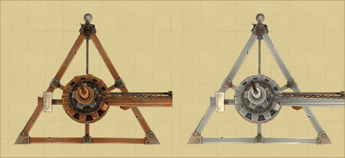Speaking of getting away with things (I hope), between fourteen rotation joints and the Mother of All Footprints, by the time I got to making recols, I had quite run out of steam, not to mention that I was getting a little fed up with the thing. So this time, I’m afraid you’ll just get two recols, the original TSM wood and metal: