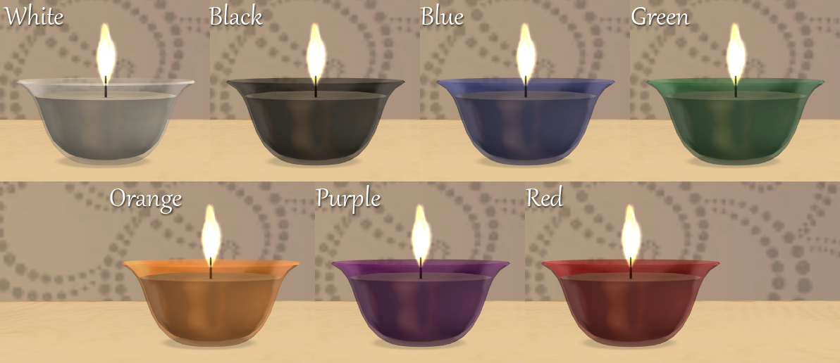 They all have the same seven recolours for the candle and the glass, which can be mixed and matched as you see fit. The table and ceiling-hanging lanterns are stand-alones, but the window lanterns are repositoried to the ceiling one (the mesh names reflect this).