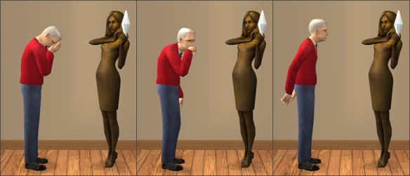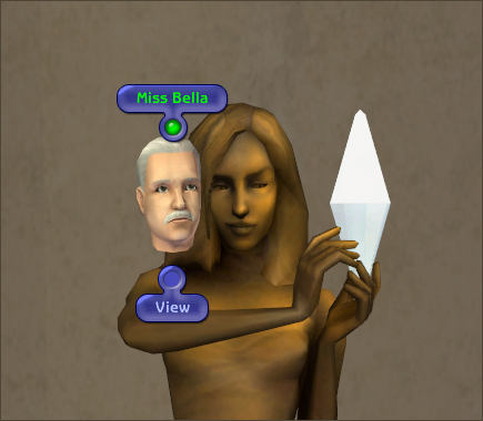 But you know me; I can’t make a deco object that just sits there, doing nuttin’. So, in addition to viewing her, Mortimer (and others) also has the option to “Miss Bella,” where he’ll either bawl his eyes out, snuffle and wipe his nose, or just sigh heavily over his lost love, depending on how the coin flips. Doing so won’t affect his motives or anything, though, so he’ll be just as grumpy afterwards as he was before. 😉