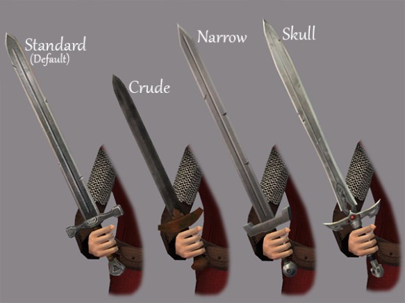But you’re absolutely right about the Crude sword – the mesh is un-nicked. (Which amuses me greatly; the one sword that you’d expect to be nicked and jagged (I think it’s a cousin of the one used to murder William de la Pole)… that’s the only one that isn’t nicked. But that’s EA for ya. ๐Ÿ™„ ) So you could absolutely get away with a texture change on that one, especially if you turn up the shiny in the TXMT. All the other swords except for the wooden ones are set to be quite shiny, so you can copy the specCoef and envcube values from one of those if you’d like (and please let me know if you think I’m speaking mumbo jumbo here; not sure how well you get along with the TXMT).