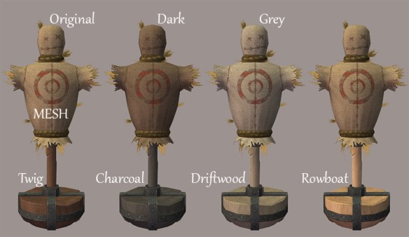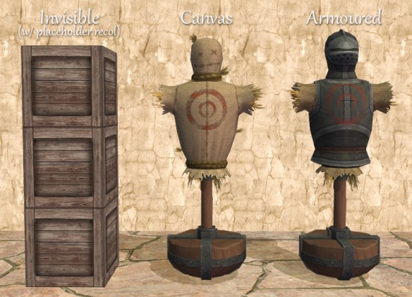 The canvas dummy has four recols for the foot in Shasta’s pirate woods and three recols for the canvas, but the armoured dummy only has foot recols (even though the armour can be recoloured). They are not repositoried; I remember the old dummies didn’t want to play nice at all when I tried to repository them, so this time, I just let it be. Less chance of my suffering an aneurysm that way. ๐Ÿ˜›