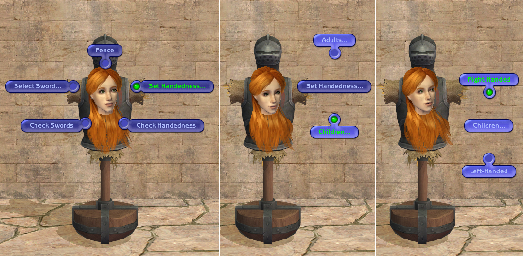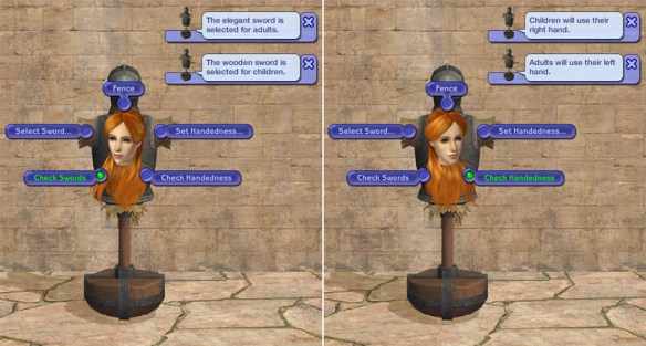 Now, I’d never force a fellow lefty, pixellated or not, to use the right (or rather wrong ๐Ÿ˜‰ ) hand if he didn’t want to, so of course I had to update my training dummies for him. (Polished the swords some while I was at it, too.) So now your Sims can choose not just which sword to fight with, but which hand as well. Left-handed high-five!