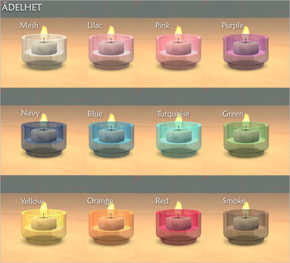 The tealight holders both come with twelve recolours. They aren’t repositoried, I had to map them slightly differently, but the recol files are tiny (between 2 and 4kb) so I don’t think they’ll break your game. πŸ˜‰