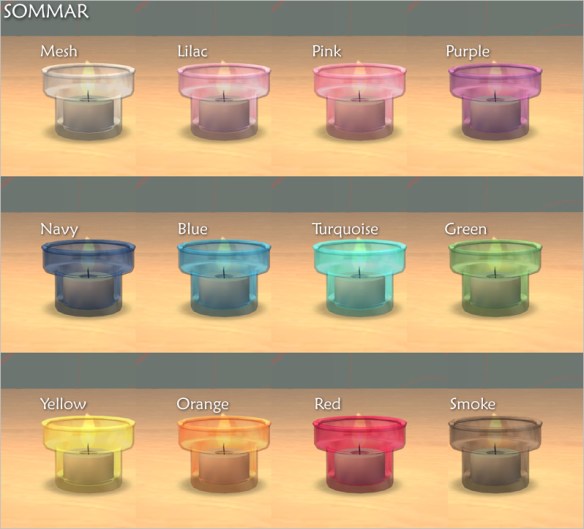 Anyway. Since it’s been a while, I thought I’d better put something up to show people that I do, in fact, live. And sim. Rummaging around in my WIP folders I found this cute little tealight holder, based on an IKEA one called SOMMAR (“summer”), that I apparently made already in 2018 but for some reason never uploaded back then. (It might simply have been that I couldn’t get it to look Exactly Like In Real Life; it’s happened before, and more than once, that I’ve scrapped something for that reason.) It was all finished, though, it just needed some recolours and it was good to go, and that was easy enough to fix.
