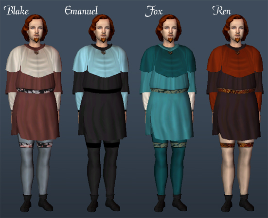 Thankee muchly. ๐ Glad you like them! The original outfit is one of my all-time favourites, there’s at least one Sim (often more) wearing it in every. single. one. of my medieval households. And yeah, this is definitely for that lagging minstrel, who then hitches a lift with a passing hay cart and waves cheerfully at his mates as he leaves them behind in the dust. ๐