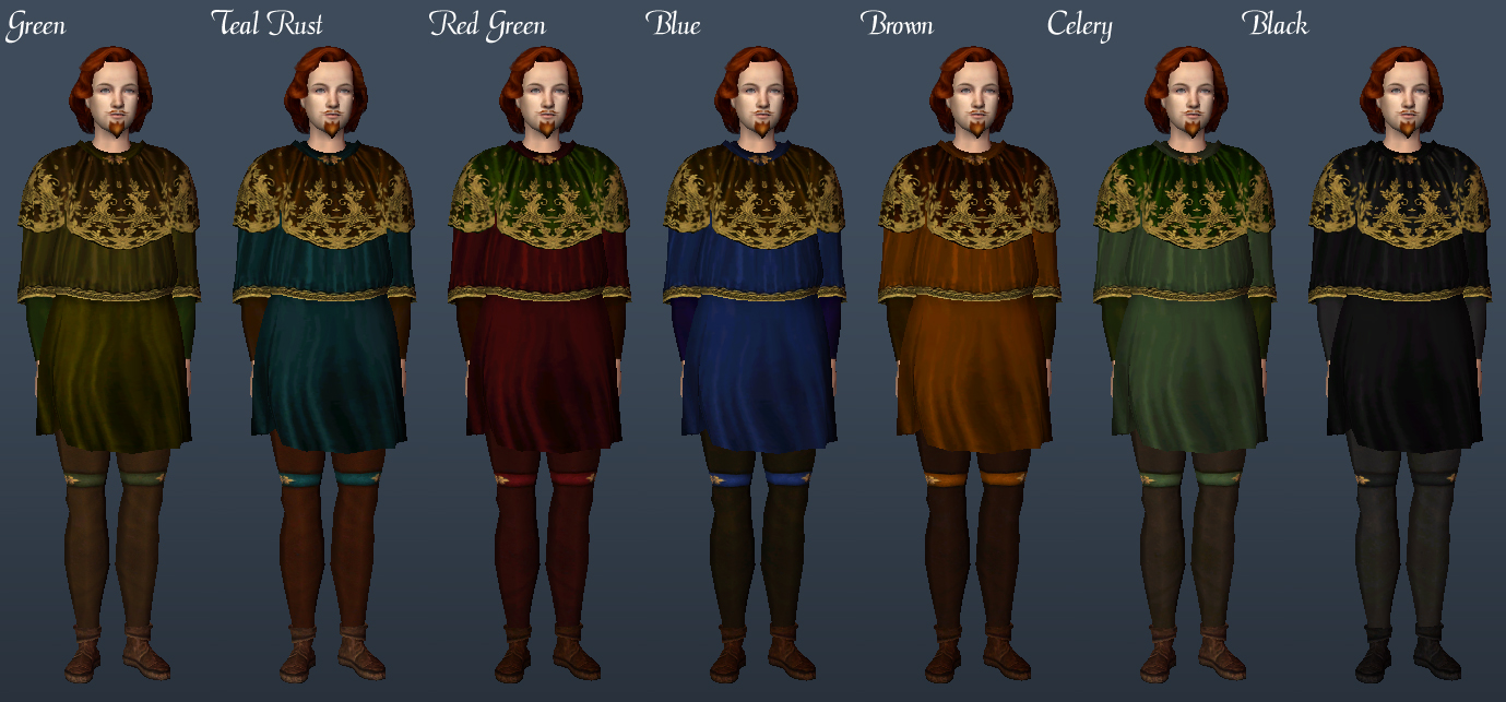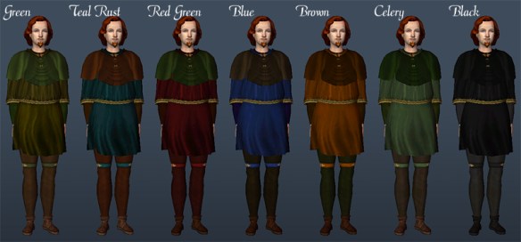 We’ll start with the Lothere’s 14 recolours. The plain ones, I’ve categorised as everyday, athletic and outerwear, but not as formal. The formal, gold-embroidered ones on the other hand, I’ve categorised as everyday, formal and outerwear, but not as athletic. (I thought the plain ones not quite fancy enough for formal wear, but the formal ones a little too fancy for athletic wear.) King Richard in the title pic is wearing the formal red & green one.