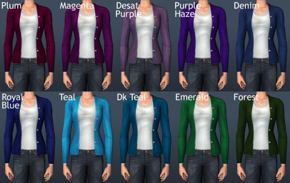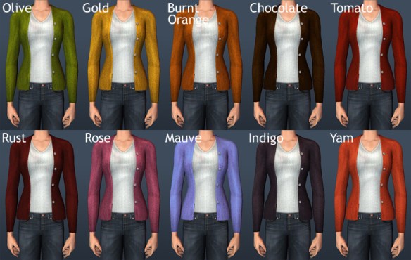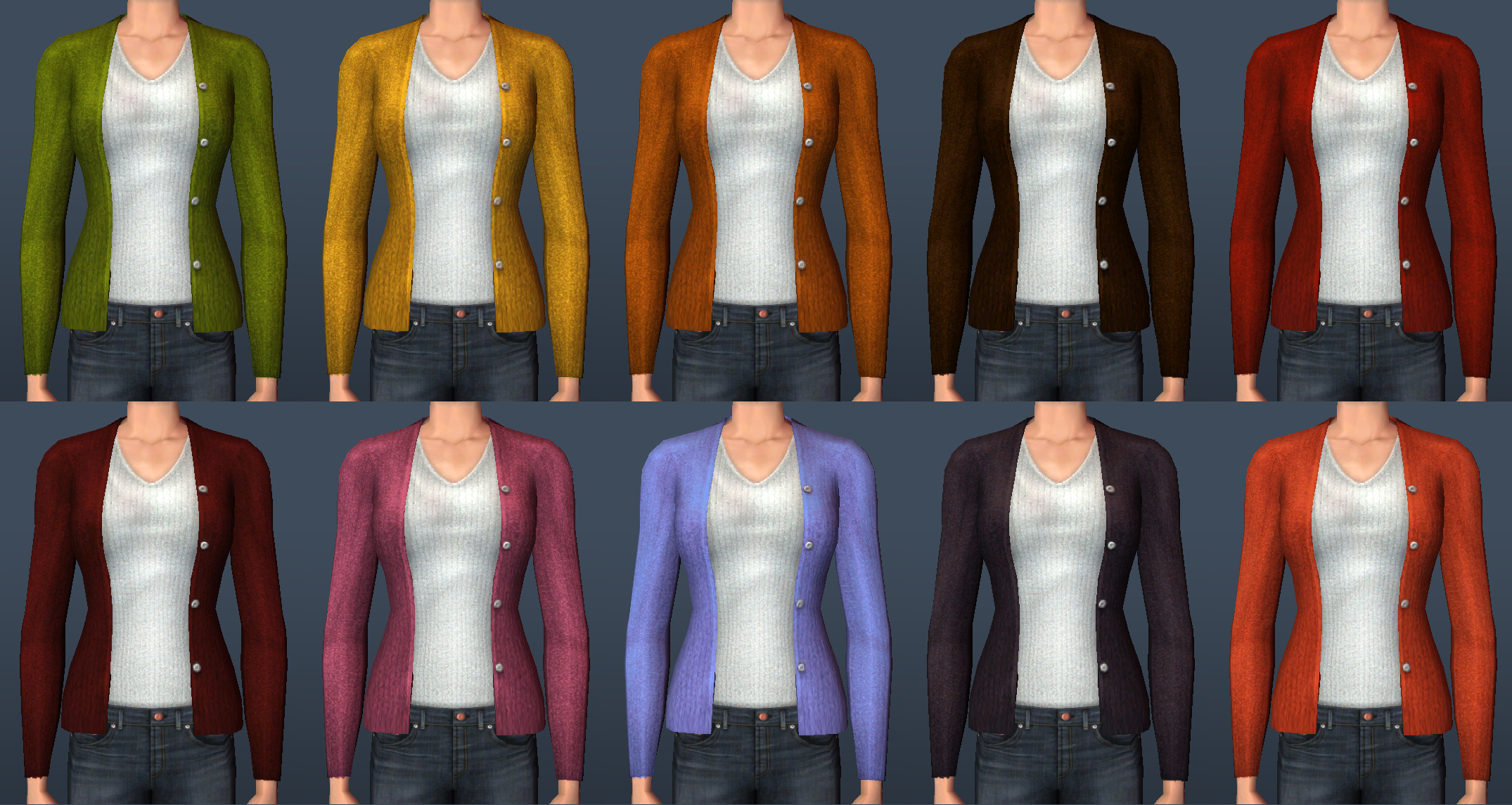 The cardigan comes in Aelia’s 20 colours, for both tee variations (so 40 recols all in all). They’re for YAEF, but to save space the EF ones are texture referenced to AF, meaning you need to have the corresponding AF recols in game for the EF ones to display properly.