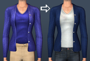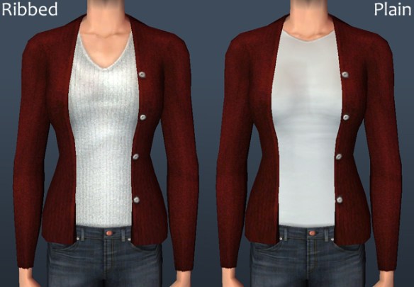 Eagle-eyed downloaders might have noticed something in the screen shots: the sweater set is being worn with low-rise trousers (a pair of the H&M jeans, to be specific). That’s because I’ve also made an (optional!) untuckable mesh default, and my recols were made for that mesh (even though they of course work with the original Maxis mesh as well).