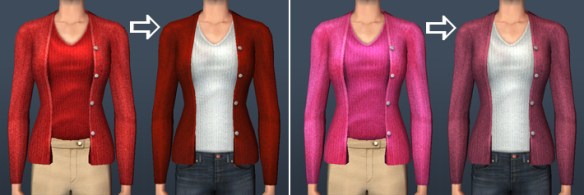But just in case you’d like to use my untuckable mesh replacement but don’t want your Sims to show their bellies, at least not with the Maxis recols (can’t do anything about custom ones), I’ve also made a default that replaces both the mesh and the textures. I’m not all that keen on the Maxis colours, though, they’ve always been a bit too garish for my taste, so instead I’ve used three of my Aelia recols: Tomato (red), Rose (pink) and Denim (blue).