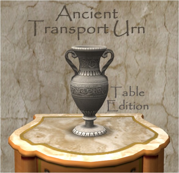 If you think this looks a lot like the Ancient Transport Urn from the base game, then you… are absolutely correct. π This is the Ancient Transport Urn, only without the column and reduced in size so you can put it on a table or a shelf. It’s base-game compatible, but it can be placed on all surfaces – including, but not limited to, OFB shelves and deco slots like on dressers and mantles.